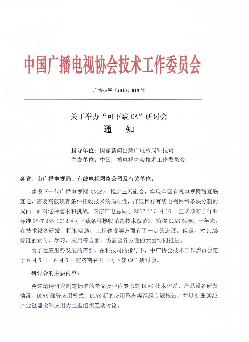 為了進一步推廣落實下載CA,2013年6月5日-6日,在總局科技司支持下,中國廣播電視技術協會技術工作委員會將在濟南召開“可下載CA研討會”,在本次會議上,將重點就DCAS技術體系、產品設備研發情況、DCAS部署應用模式、DCAS向多終端的新的應用形態等組織專題報告,并以推進DCAS產業鏈建設和應用為主題組織互動討論,敬請關注。