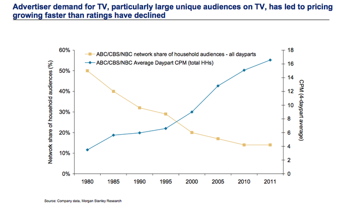 電視行業(yè)的沒落對于電視廣告銷售額產(chǎn)生了違反常理的作用:電視廣告的價(jià)格不降反升,盡管廣告的數(shù)量減少了。
