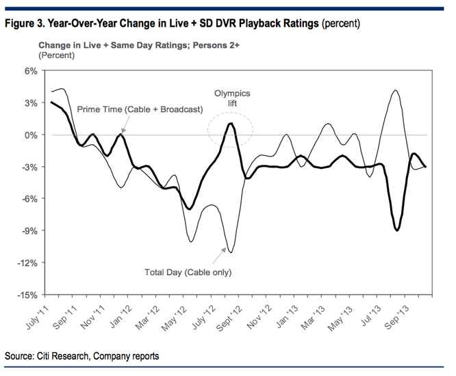 Research)稱,從2011年9月以來,廣播電視和有線電視的收視率,一直呈現(xiàn)出負(fù)增長,僅在奧運(yùn)會(huì)期間有所緩解。