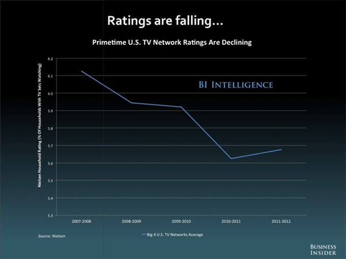 這是一個(gè)宏觀的問題:收視率正在全盤下跌。這種情況已持續(xù)了好幾年。廣播電視的收視率下跌并不怎么令人驚訝。多年來,主流廣播電視網(wǎng)一直面臨著來自有線電視頻道以及AMC和HBO等優(yōu)質(zhì)電視節(jié)目供應(yīng)商的激烈競爭。