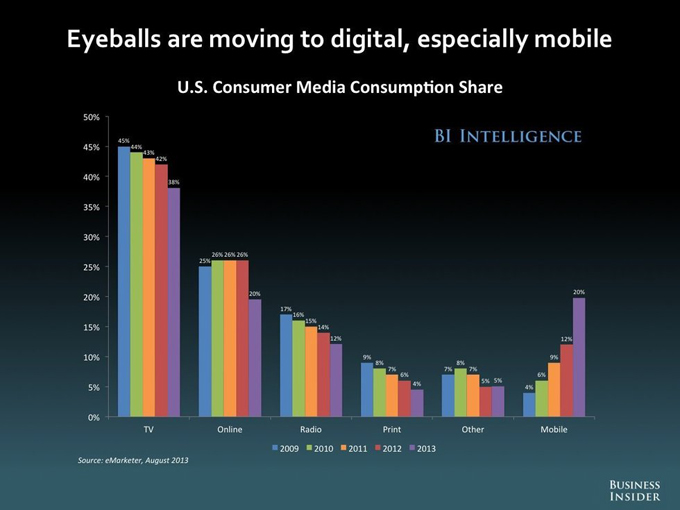 從下圖中可以看出,人們在移動(dòng)設(shè)備上花的時(shí)間越來越長,而在電視上花的時(shí)間越來越少。