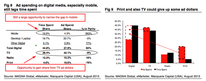 麥格理投資銀行(Macquarie Capital)的研究表明,消費(fèi)者長時(shí)間呆的地方與廣告商投錢的地方嚴(yán)重錯(cuò)位。現(xiàn)在,人們花費(fèi)在數(shù)字媒體上的時(shí)間多于電視;而廣告商投放在電視上的廣告費(fèi)用卻要高于數(shù)字媒體。麥格理投資銀行稱,從長遠(yuǎn)來說,這種錯(cuò)誤最終會(huì)得到糾正,廣告費(fèi)用會(huì)逐步轉(zhuǎn)移到數(shù)字媒體上。