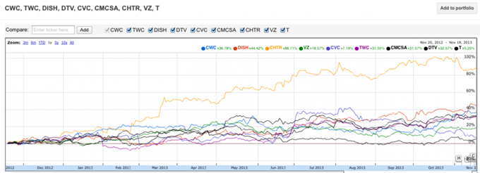 下圖顯示的是多只有線電視股票去年的表現(xiàn)。說實(shí)話,還真不錯(cuò)!