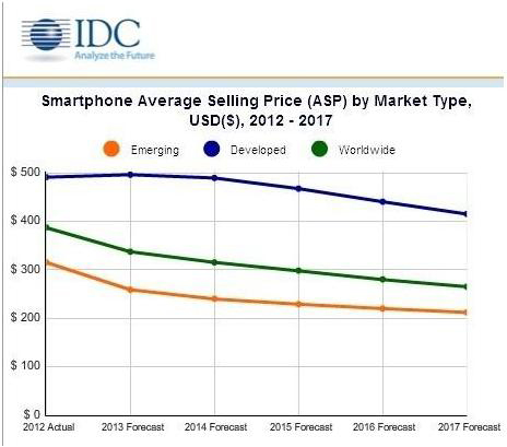 10億這個(gè)數(shù)字相比2012年全球智能手機(jī)出貨量整整增長(zhǎng)39.3%,這樣的增長(zhǎng)速度對(duì)于已經(jīng)趨于飽和的智能手機(jī)市場(chǎng)來(lái)說(shuō)是非常驚人的,原因是智能手機(jī)價(jià)格大幅下降,見(jiàn)上圖。