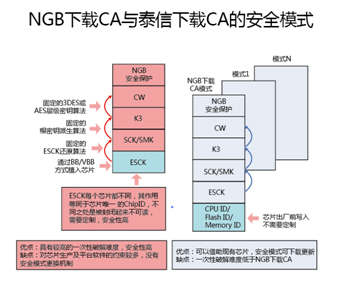上圖中,終端芯片中的Chip ID、ESK根密鑰都是與硬件關聯的標示,二者都是與硬件關聯,且不可更改,具有等同的作用。所不同的是ChipID沒有包裹黑盒,是可見的,以此為安全基礎芯片不需要定制;ESK按照NGB下載CA的要求是不可見的,以此為安全基礎芯片需要定制。