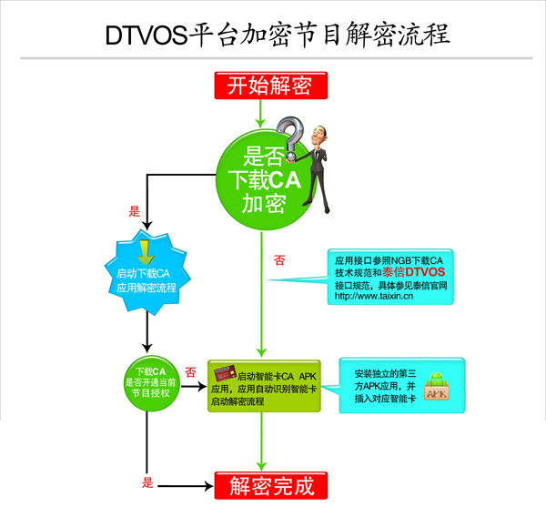 智能終端的普及為泰信下載CA提供了理想的應用環境。在系統開始運行后,首先檢查系統中有沒有存在下載CA,如果發現電視網絡中沒有泰信下載CA系統,將執行外部的CA應用APK,比如第三方的下載CA 或者智能卡CA應用,從而實現運行DTVOS的終端可以支持跨區域銷售。工作流程圖如下: