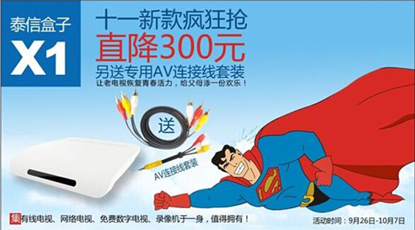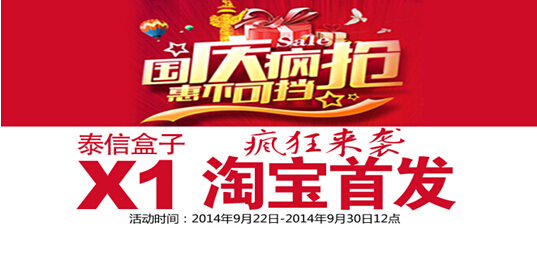淘寶促銷篇泰信盒子X1920日在淘寶官方店全球震撼首發。此次國慶前夕,繼續加大促銷力度,在優惠直降300元的基礎上還送AV線套裝。詳情:http://shop112060586.taobao.com/