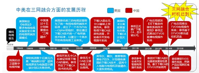 泰信電子自成立至今,幾乎經歷了三網融合發展的整個歷程。其作為下載CA技術標準制定的8家國內外參與者之一,也是唯一具備下載CA開發經驗的CA公司,積極響應中央政策,為有線電視爭取時間窗口,促使封閉的有線電視產業與互聯網融合發展。見下圖: