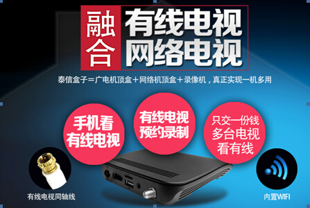 融合型智能高清有線電視機頂盒——泰信盒子,搭載泰信自主研發(fā)的直播電視操作系統(tǒng)DTVOS,融合廣電有線電視、網(wǎng)絡(luò)電視、錄像機等功能,實現(xiàn)全國性跨區(qū)域市場化銷售,讓廣大用戶購買有線電視機頂盒不必通過廣電,可以自由選擇,而且兼容了網(wǎng)絡(luò)電視的功能,讓您省掉一臺網(wǎng)絡(luò)機頂盒的費用。泰信電子這種歷史性的創(chuàng)新為廣電終端智能化和市場化發(fā)展鋪平道路,進而推動三網(wǎng)融合的落地和信息消費,讓老百姓看電視更方便。