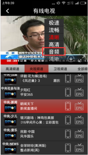 還有一點(diǎn)也很神奇,比如早上開車族想聽一下《朝聞天下》,那么就可以點(diǎn)擊音頻按鈕,實(shí)時(shí)廣播電視直播的內(nèi)容,是不是很貼心?