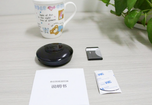 泰信智能溫控器包裝簡約穩(wěn)妥,造型小巧精致,黑色塑料鋼琴烤漆,標(biāo)配一塊1500 mAh的鋰電池,附贈固定用的3M膠貼。