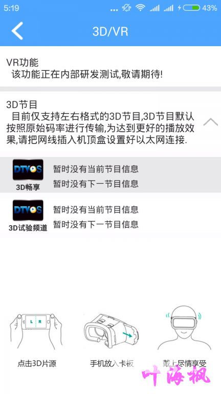 3D功能指的是有線電視中已經(jīng)開播的3D頻道,而VR是目前較火的娛樂項目,用戶在這里可以通過VR眼鏡近距離大屏體驗3D節(jié)目或有線直播,此功能目前還在進(jìn)一步完善中。(即將推出)