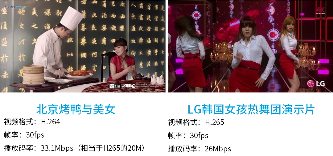 這是我們?cè)陔娨曎u場(chǎng)經(jīng)常看到的兩個(gè)4K超高清演示片及參數(shù)。這樣的碼流速度即使你家中安裝了千兆帶寬也難以順暢地傳輸,只能下載到本地用U盤播放。