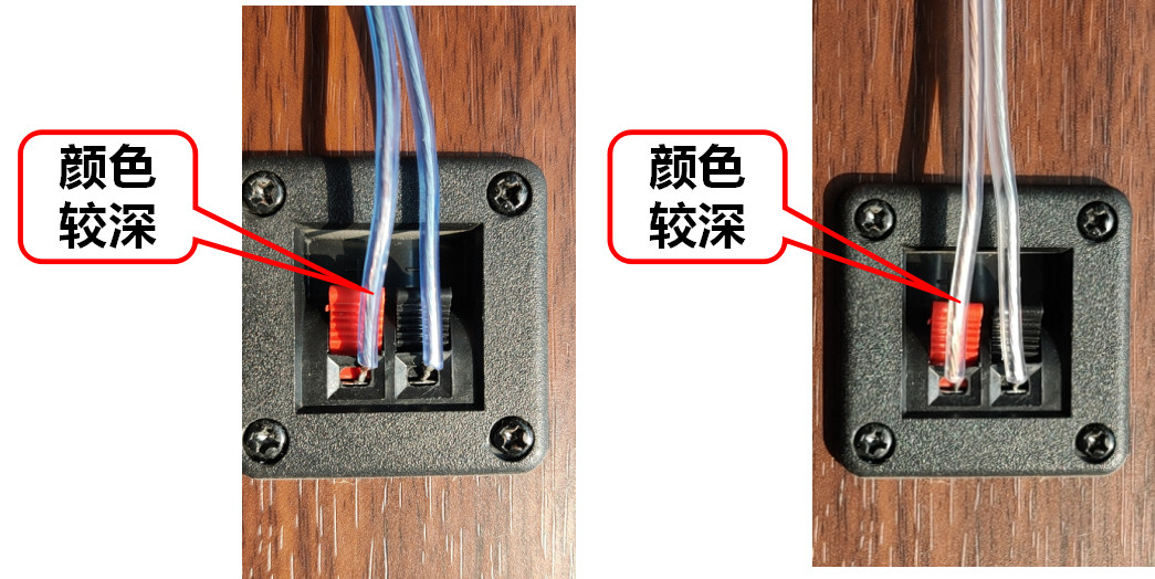 特別注意:顏色較深的接紅色接線柱。同樣的道理,如果使用T70配自購的音箱,接線一定要正確。