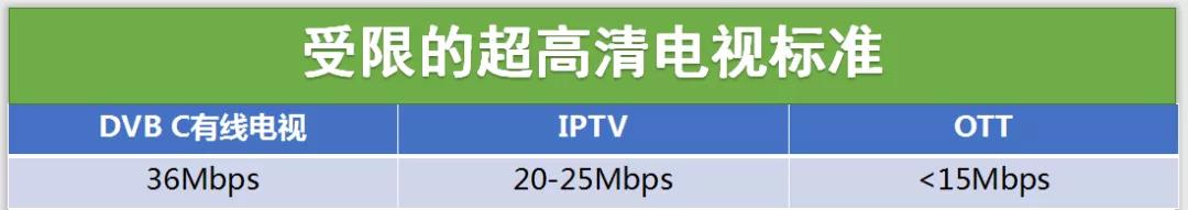 有線電視緊跟央視超高清的開播立馬進行傳輸,一方面是應對市場競爭,另一方面也是有線電視的特殊的廣播傳輸優勢,可以無障礙地傳輸各種超高清電視信號。詳細原因請點擊:為什么使用4K網絡機頂盒或電視機看不到4K超高清內容?以下是各種超高清電視信號所需的傳輸帶寬。