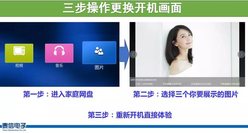使用這個功能,你可以將手機拍攝的子女照片在老家父母的電視上展示或播放,讓眼神不好的老人能在電視大屏上看到他們,盡享天倫之樂。當然,也可以把外出旅游的照片,通過手機推送到電視大屏的開機頁上顯示。