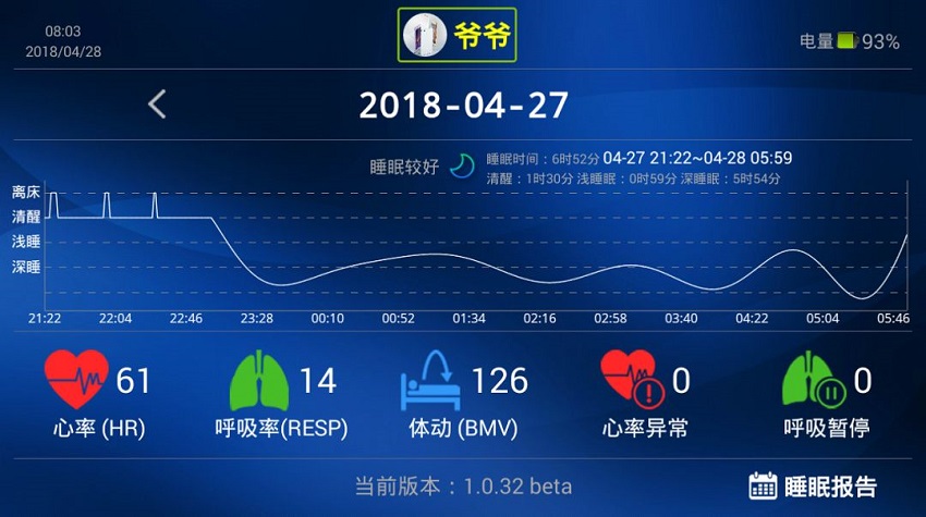 在電視大屏和手機小屏上都可以展示睡眠健康信息,方便老人和子女觀察。 這是一個上班族對媽媽夜晚睡眠數據報告的解讀。借助人工智能,使用傳感器的時間越長,分析的結果就越準確。