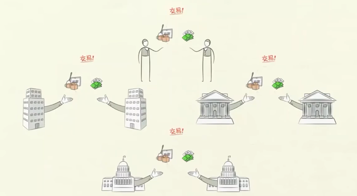 達(dá)利歐在他的視頻中,將交易主體范圍擴(kuò)大到了中央政府和中央銀行,描述了由交易引起的另外兩種經(jīng)濟(jì)現(xiàn)象,一個是短期債務(wù)周期,一個是長期債務(wù)周期,涉及到了大量的宏觀經(jīng)濟(jì)學(xué)知識。