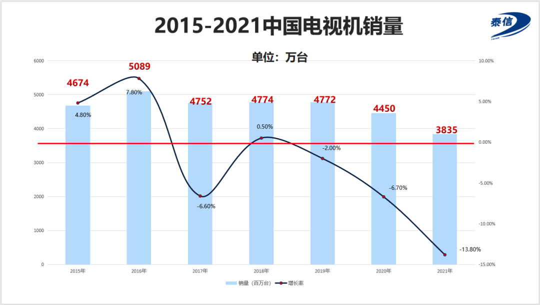 國內(nèi)電視機(jī)銷量在2021年下降了13.8%,但銷售額卻增長了6.6%。主要原因是43寸以下的低價(jià)機(jī)型出貨比例下降,65寸以上的大尺寸電視出貨比例增加。